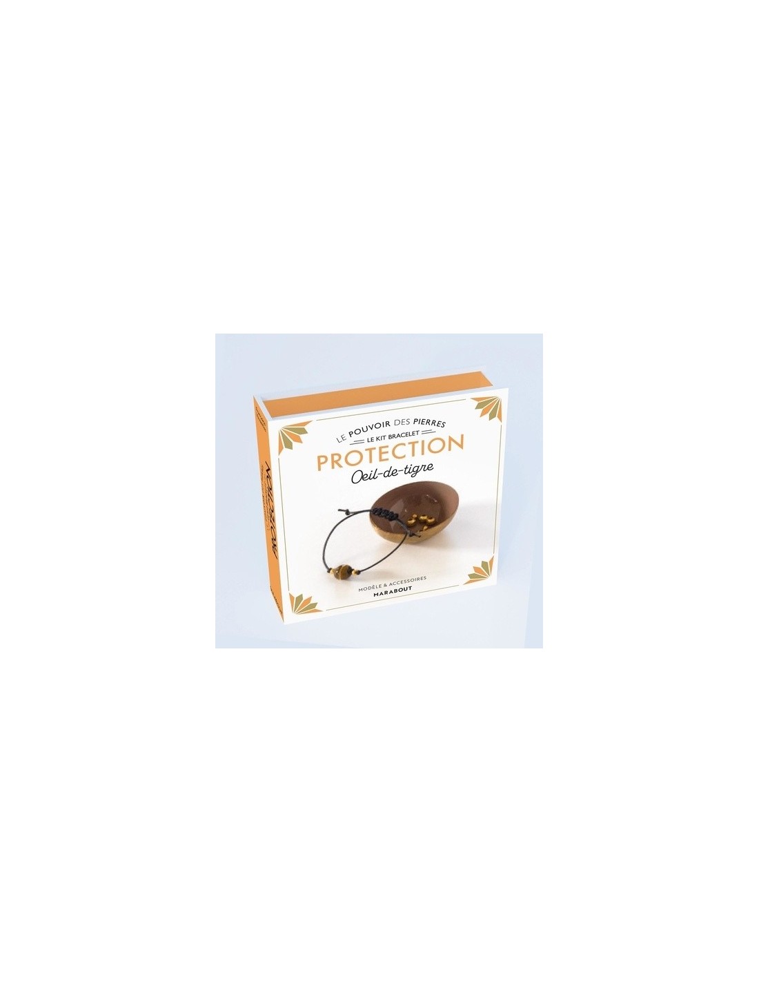 Le coffret comprend : 1 pierre naturelle en oeil de tigre ; 2 petites perles dorées ; 40 cm de coton ciré ; Des explications pas à pas en photos.
